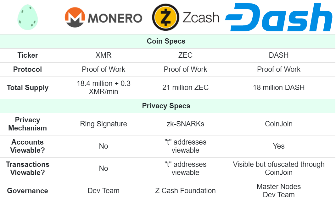 Examples and comparison of privacy coins