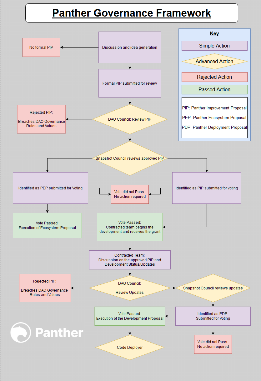 - The formation of a DAO Council, which will be entrusted with reviewing Panther Improvement Proposals (PIPs) from our Discourse forum. By verifying the alignment of proposals with Panther DAO’s mission, vision, and values, the Council will effectively weed out spam requests and proposals that are out of budget or misaligned with Panther's scope and roadmap.